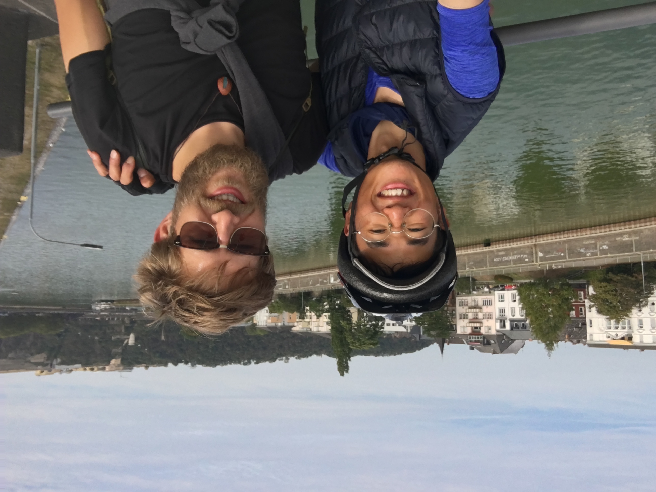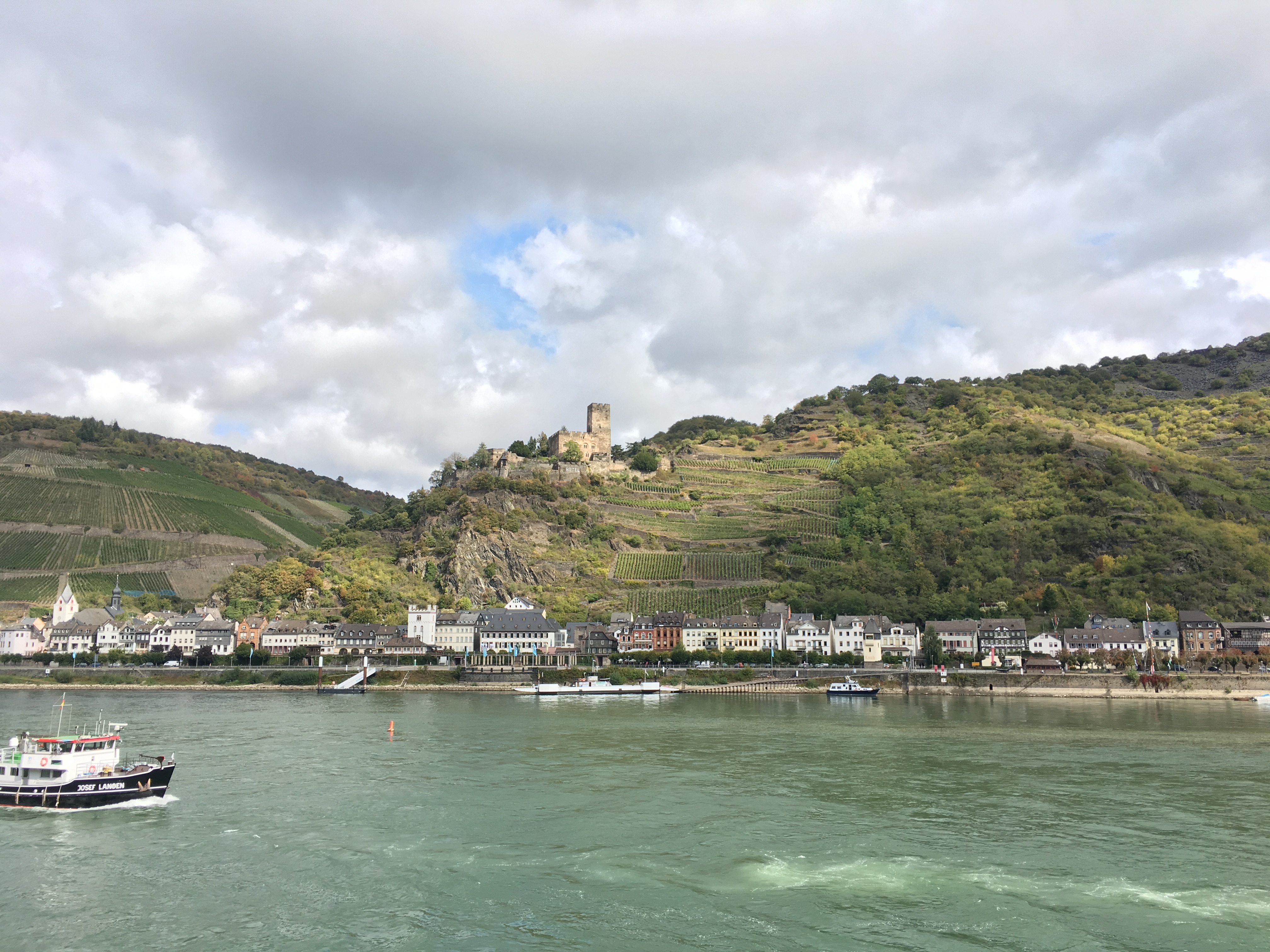 방향을 돌린 후, 주택 몇 개를 지나자마자 완전 딴 세상이 펼쳐졌다. 눈앞에 에메랄드빛 라인강이 나타나더니 시야가 확 트였다. 라인강 반대편에는 앞서 말했든 작고 예쁜 집들이 나란히 서 있었고, 그 뒤에 가파른 언덕 위로는 포도밭과 고성이 자리잡고 있었다. 그야말로 한 폭의 그림과도 같은 풍경이었다.